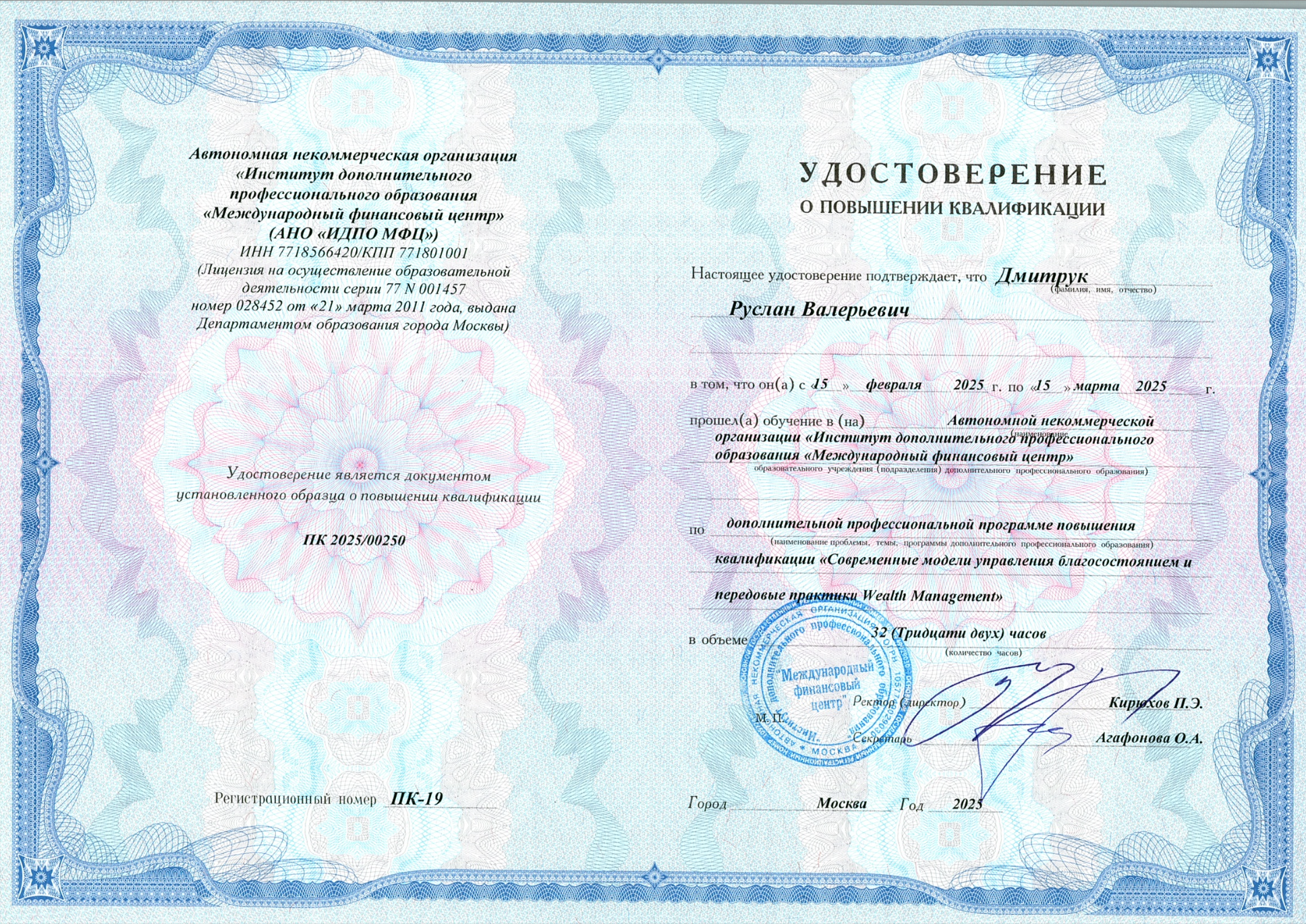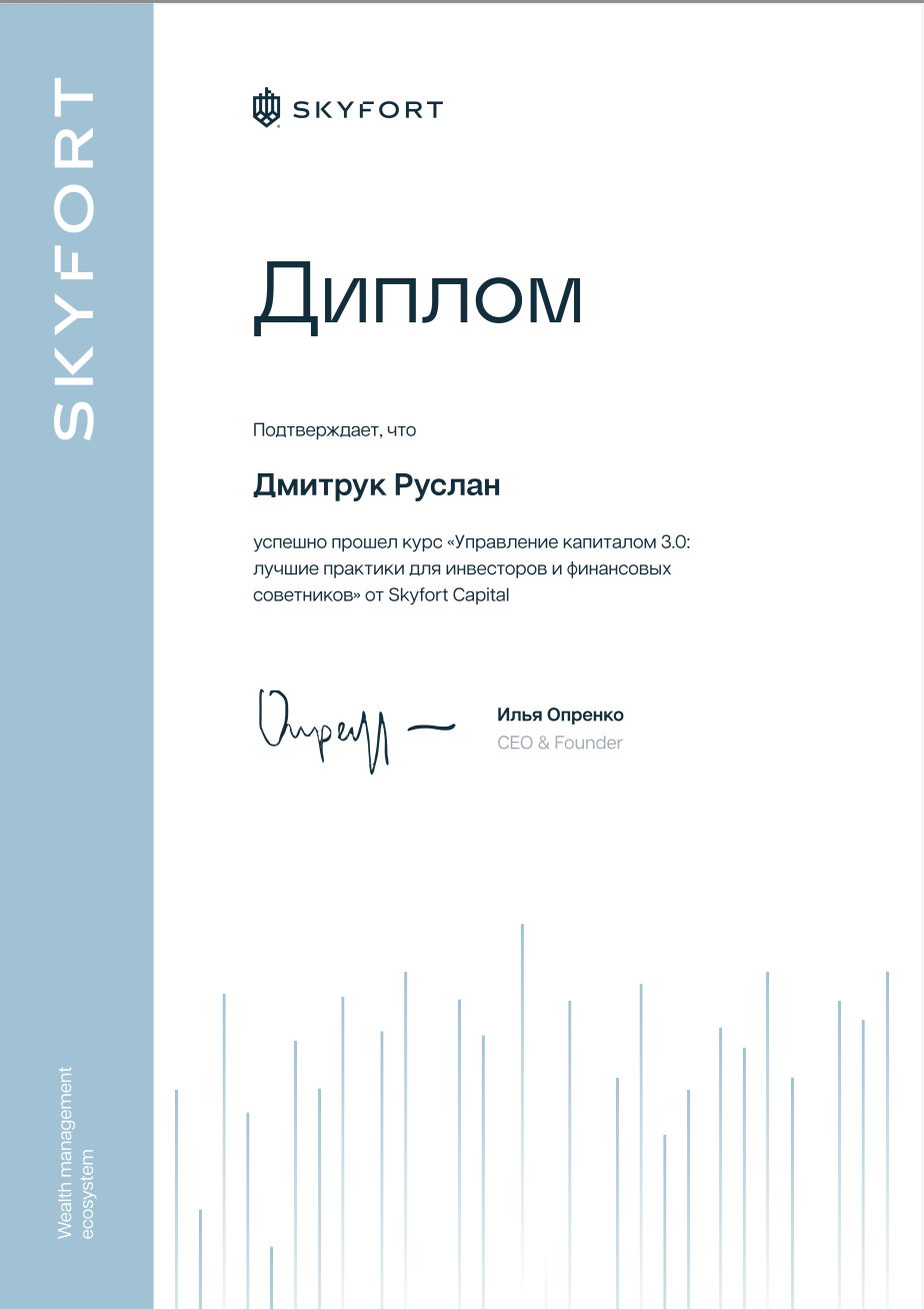Я прошёл профессиональное обучение с дипломом гособразца и стал международным финансовым советником. Почему "международный"? Потому что я сам переехал, знаю, что значит жить и инвестировать за рубежом. Сейчас мои клиенты — это релоканты, эмигранты, предприниматели, частные инвесторы, семьи.